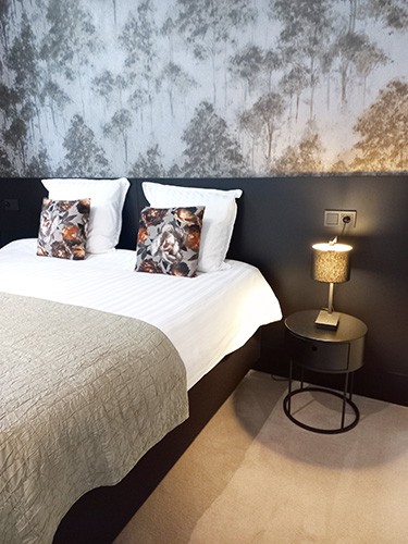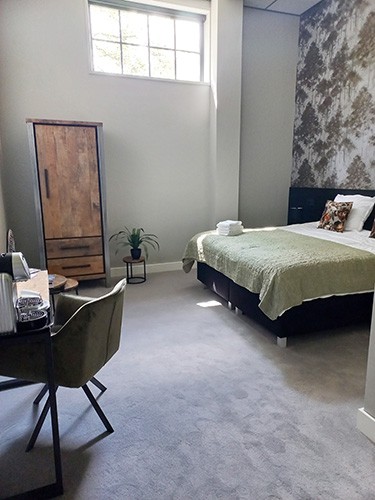 Standaard kamer tussen kamer 3 en kamer 5. Bij het openen van de kamer voel je de rust over je heen komen door onze warme tinten van mosgroen en het behang van design met uitstraling van bomen. Bijpassende kussens en afgestyled met andere kleuren groen en bloemen. Onze kamers hebben ieder hun eigen thema’s en styling.